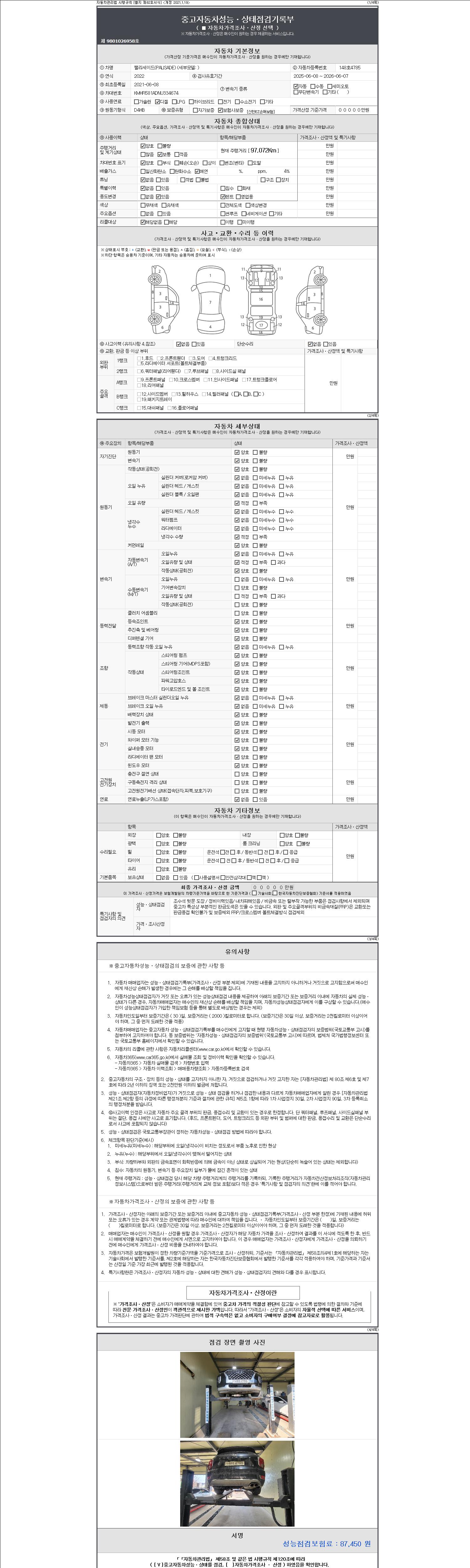 자동차관리법 시행규칙 제120조의 규정에 따라 별지 제 82호서식 《중고자동차 성능, 상태점검 기록부》를 발행한 성능, 상태점검자 및 매매자는 아래의 보증기간 또는 보증거리 이내의 중고자동차, 성능점검 기록부에 기재된 내용과 자동차의 실제 성능, 상태가 다른 경우 계약 또는 관계법령에 따라 매수인에 대하여 책임을 집니다.