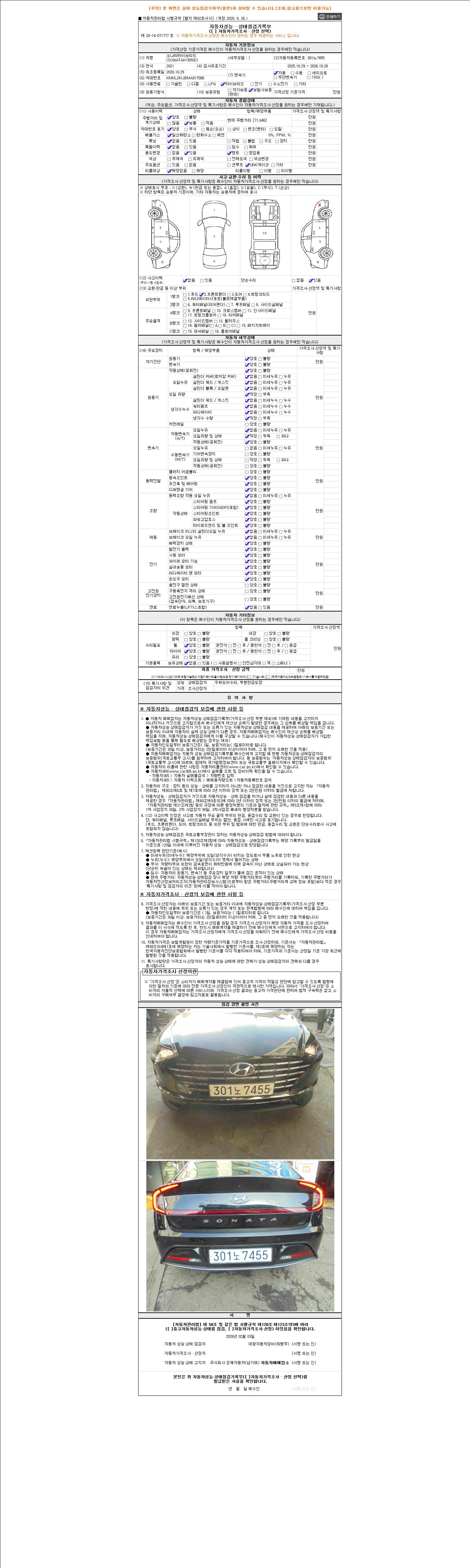자동차관리법 시행규칙 제120조의 규정에 따라 별지 제 82호서식 《중고자동차 성능, 상태점검 기록부》를 발행한 성능, 상태점검자 및 매매자는 아래의 보증기간 또는 보증거리 이내의 중고자동차, 성능점검 기록부에 기재된 내용과 자동차의 실제 성능, 상태가 다른 경우 계약 또는 관계법령에 따라 매수인에 대하여 책임을 집니다.