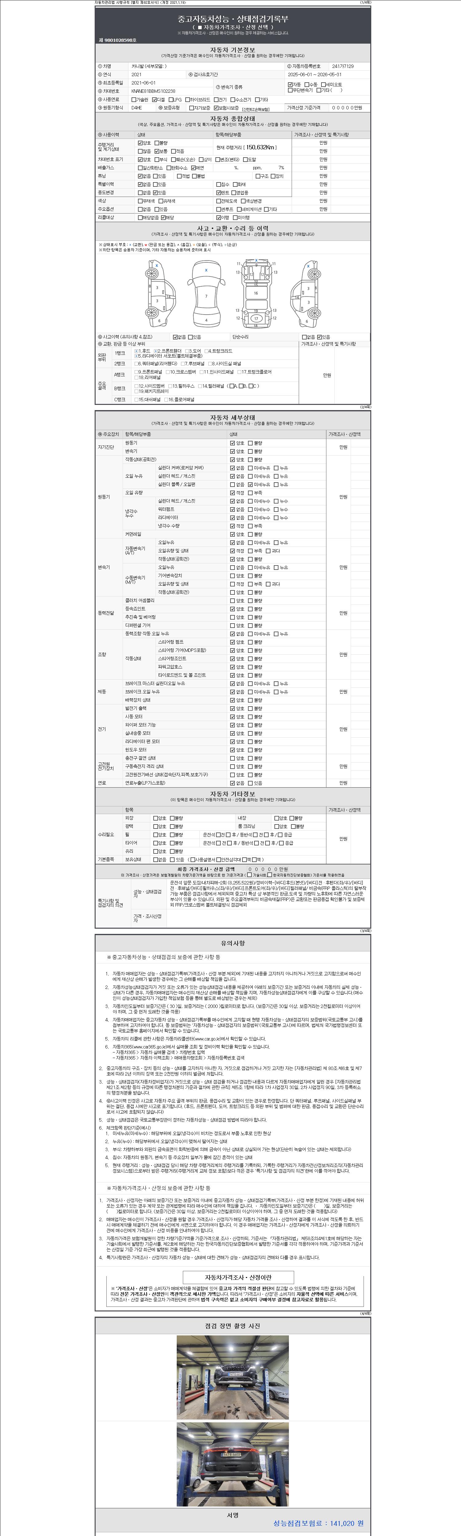 -중고자동차 매매업자를 통해 차량을 구입하실 경우 반드시 "중고자동차 성능, 상태점검 기록부"를 교뷰 받으셔야 하며, 매매업자는 반드시 의무 교부 하여야 압니다.