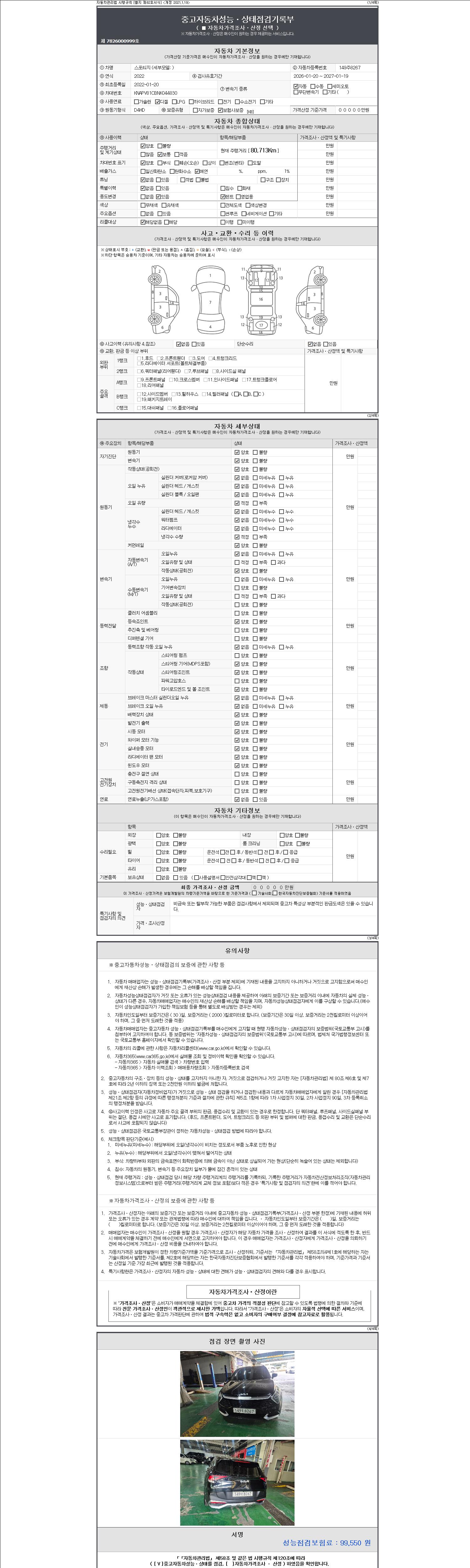 자동차관리법 시행규칙 제120조의 규정에 따라 별지 제 82호서식 《중고자동차 성능, 상태점검 기록부》를 발행한 성능, 상태점검자 및 매매자는 아래의 보증기간 또는 보증거리 이내의 중고자동차, 성능점검 기록부에 기재된 내용과 자동차의 실제 성능, 상태가 다른 경우 계약 또는 관계법령에 따라 매수인에 대하여 책임을 집니다.
