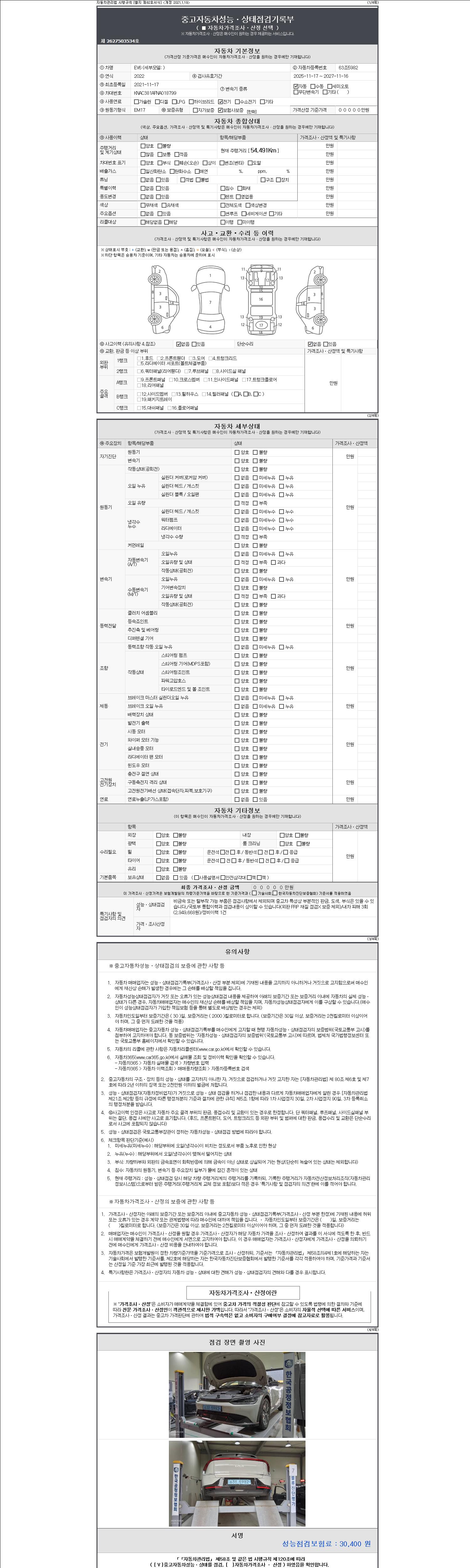 자동차관리법 시행규칙 제120조의 규정에 따라 별지 제 82호서식 《중고자동차 성능, 상태점검 기록부》를 발행한 성능, 상태점검자 및 매매자는 아래의 보증기간 또는 보증거리 이내의 중고자동차, 성능점검 기록부에 기재된 내용과 자동차의 실제 성능, 상태가 다른 경우 계약 또는 관계법령에 따라 매수인에 대하여 책임을 집니다.