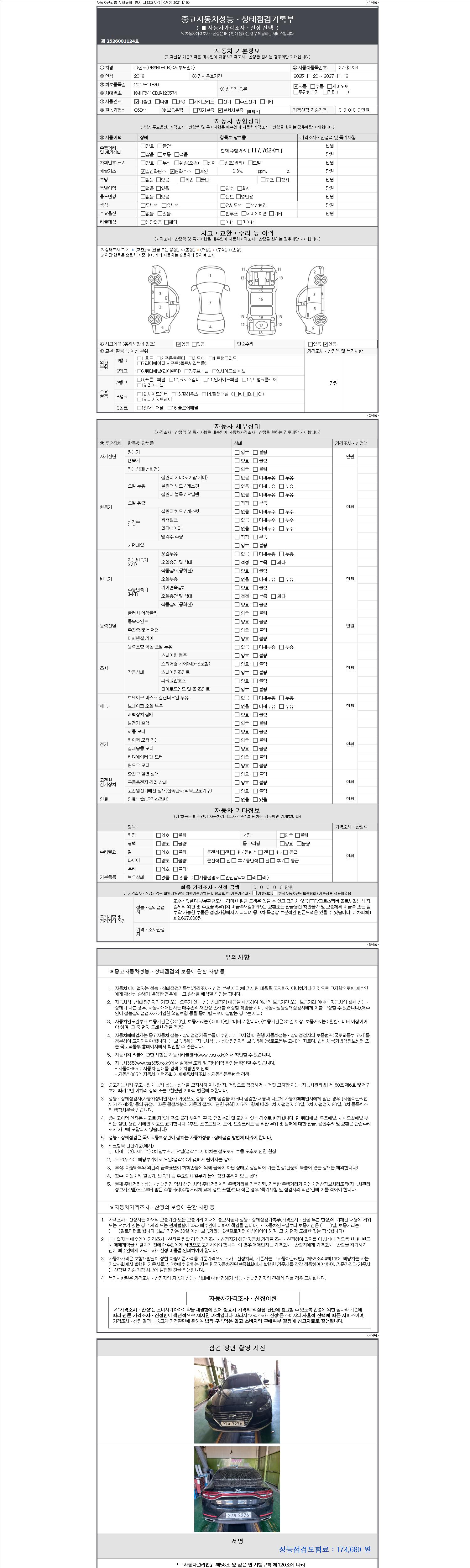 자동차관리법 시행규칙 제120조의 규정에 따라 별지 제 82호서식 《중고자동차 성능, 상태점검 기록부》를 발행한 성능, 상태점검자 및 매매자는 아래의 보증기간 또는 보증거리 이내의 중고자동차, 성능점검 기록부에 기재된 내용과 자동차의 실제 성능, 상태가 다른 경우 계약 또는 관계법령에 따라 매수인에 대하여 책임을 집니다.