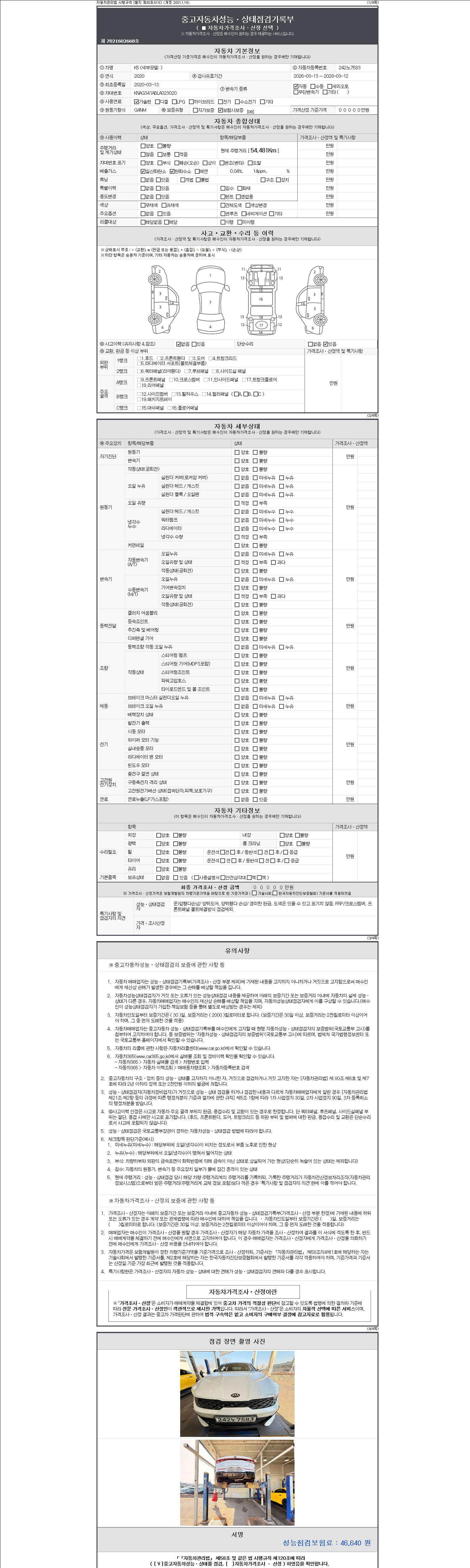 자동차관리법 시행규칙 제120조의 규정에 따라 별지 제 82호서식 《중고자동차 성능, 상태점검 기록부》를 발행한 성능, 상태점검자 및 매매자는 아래의 보증기간 또는 보증거리 이내의 중고자동차, 성능점검 기록부에 기재된 내용과 자동차의 실제 성능, 상태가 다른 경우 계약 또는 관계법령에 따라 매수인에 대하여 책임을 집니다.