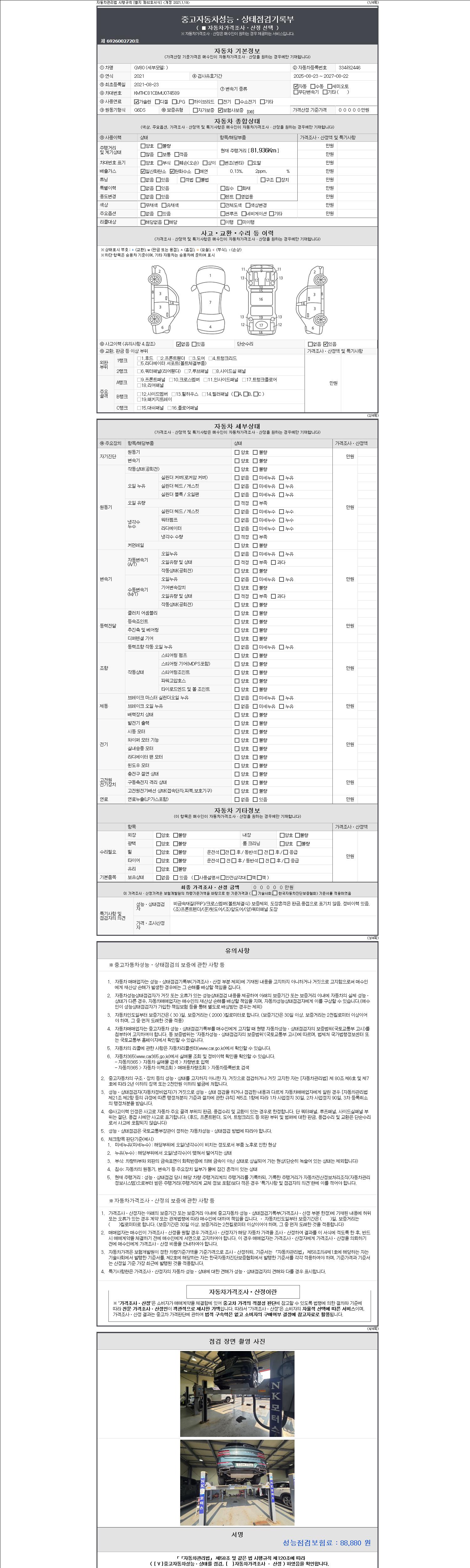 자동차관리법 시행규칙 제120조의 규정에 따라 별지 제 82호서식 《중고자동차 성능, 상태점검 기록부》를 발행한 성능, 상태점검자 및 매매자는 아래의 보증기간 또는 보증거리 이내의 중고자동차, 성능점검 기록부에 기재된 내용과 자동차의 실제 성능, 상태가 다른 경우 계약 또는 관계법령에 따라 매수인에 대하여 책임을 집니다.