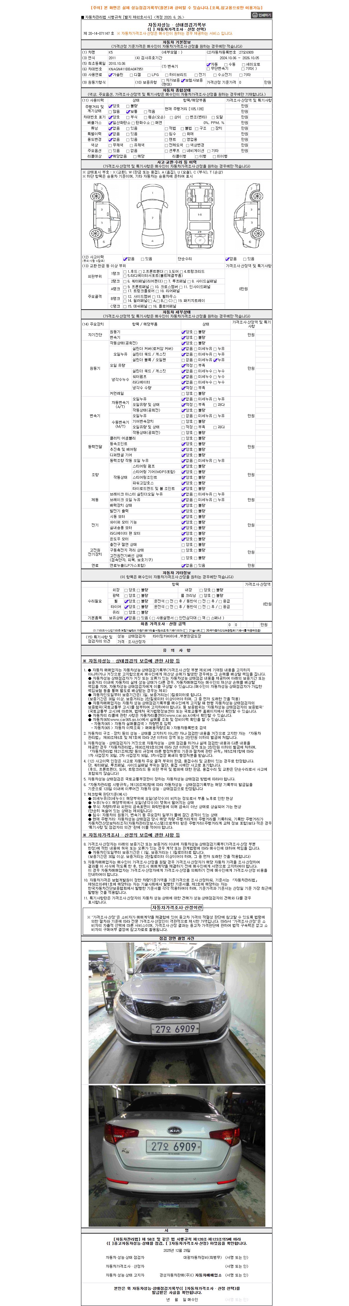 -중고자동차 매매업자를 통해 차량을 구입하실 경우 반드시 "중고자동차 성능, 상태점검 기록부"를 교뷰 받으셔야 하며, 매매업자는 반드시 의무 교부 하여야 압니다.
