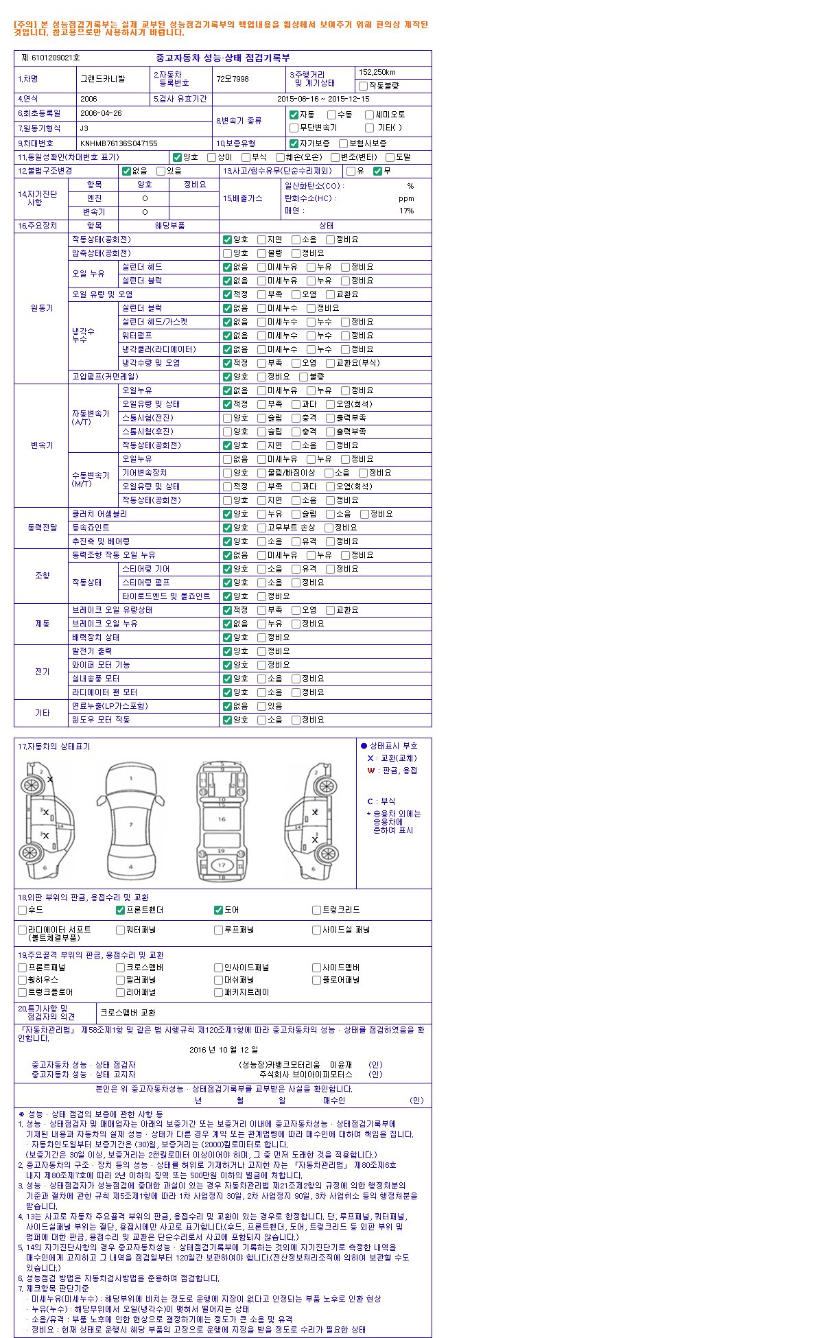 자동차관리법 시행규칙 제120조의 규정에 따라 별지 제 82호서식 《중고자동차 성능, 상태점검 기록부》를 발행한 성능, 상태점검자 및 매매자는 아래의 보증기간 또는 보증거리 이내의 중고자동차, 성능점검 기록부에 기재된 내용과 자동차의 실제 성능, 상태가 다른 경우 계약 또는 관계법령에 따라 매수인에 대하여 책임을 집니다.