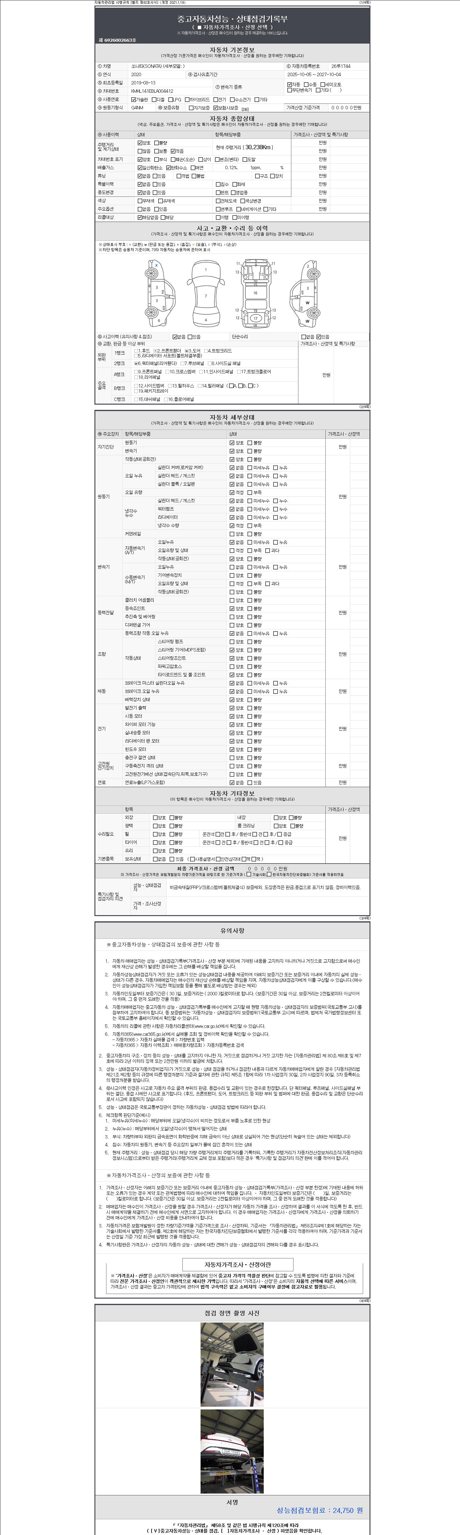 자동차관리법 시행규칙 제120조의 규정에 따라 별지 제 82호서식 《중고자동차 성능, 상태점검 기록부》를 발행한 성능, 상태점검자 및 매매자는 아래의 보증기간 또는 보증거리 이내의 중고자동차, 성능점검 기록부에 기재된 내용과 자동차의 실제 성능, 상태가 다른 경우 계약 또는 관계법령에 따라 매수인에 대하여 책임을 집니다.