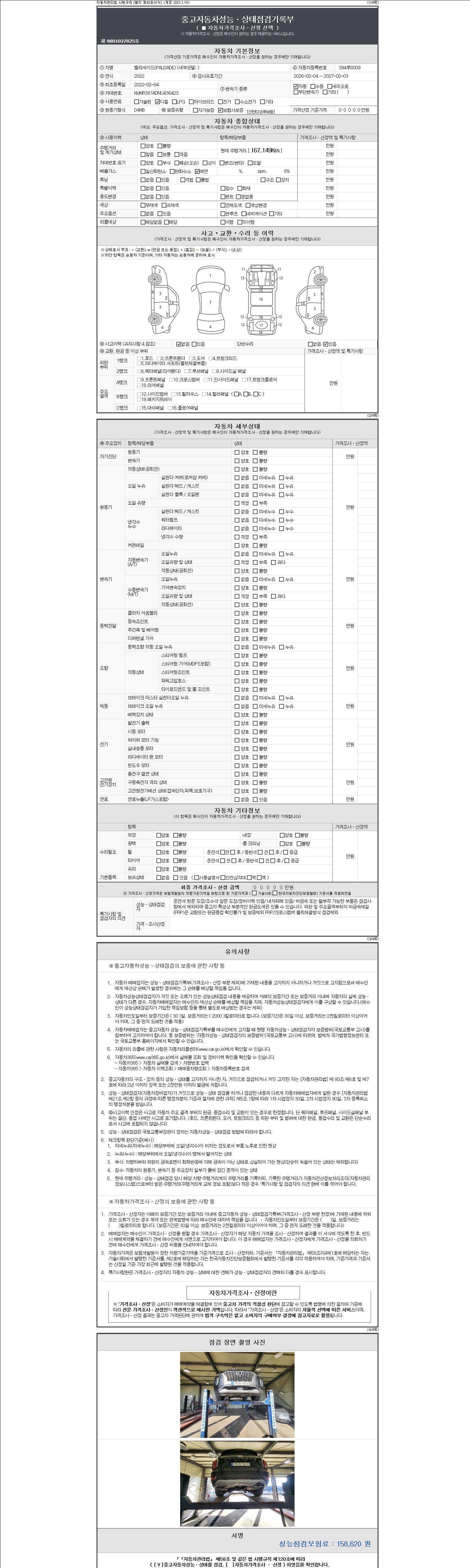 자동차관리법 시행규칙 제120조의 규정에 따라 별지 제 82호서식 《중고자동차 성능, 상태점검 기록부》를 발행한 성능, 상태점검자 및 매매자는 아래의 보증기간 또는 보증거리 이내의 중고자동차, 성능점검 기록부에 기재된 내용과 자동차의 실제 성능, 상태가 다른 경우 계약 또는 관계법령에 따라 매수인에 대하여 책임을 집니다.