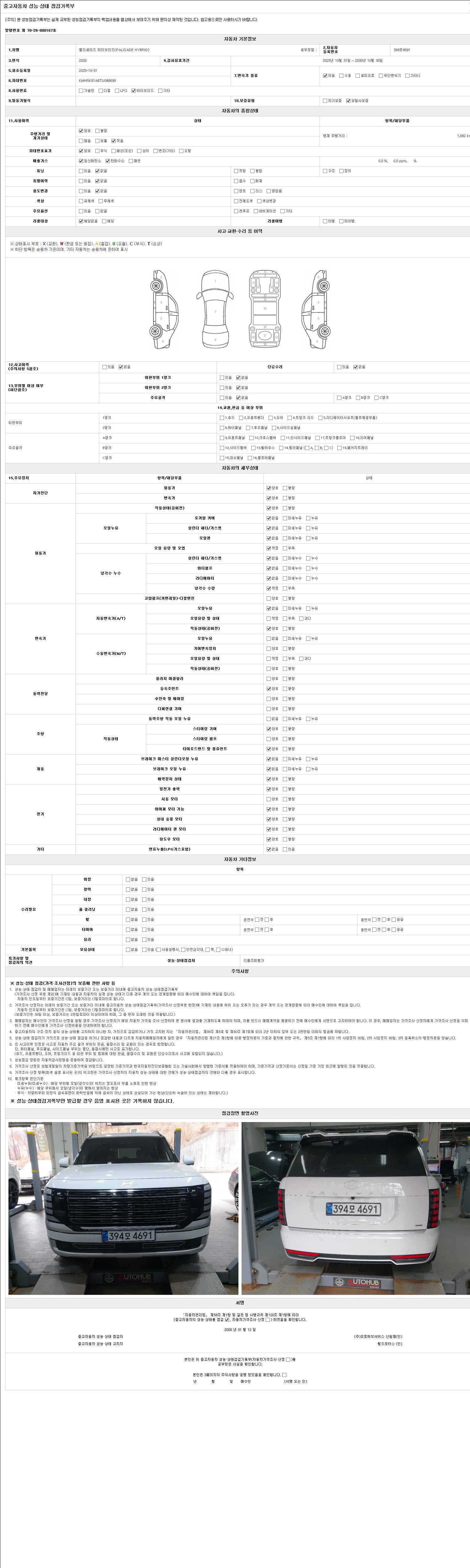자동차관리법 시행규칙 제120조의 규정에 따라 별지 제 82호서식 《중고자동차 성능, 상태점검 기록부》를 발행한 성능, 상태점검자 및 매매자는 아래의 보증기간 또는 보증거리 이내의 중고자동차, 성능점검 기록부에 기재된 내용과 자동차의 실제 성능, 상태가 다른 경우 계약 또는 관계법령에 따라 매수인에 대하여 책임을 집니다.