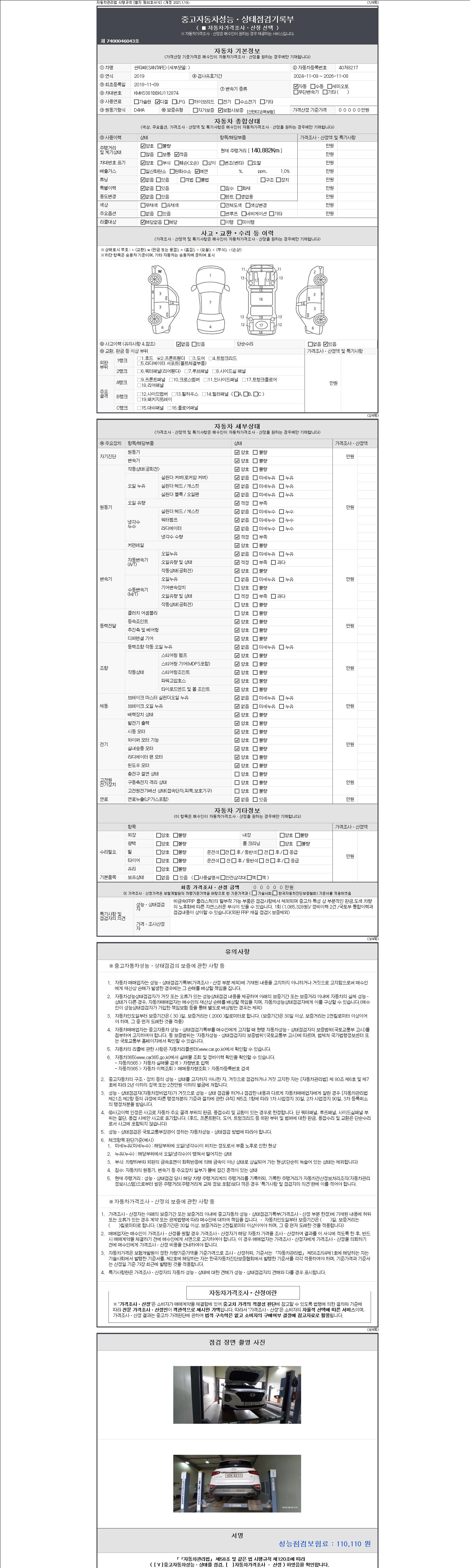자동차관리법 시행규칙 제120조의 규정에 따라 별지 제 82호서식 《중고자동차 성능, 상태점검 기록부》를 발행한 성능, 상태점검자 및 매매자는 아래의 보증기간 또는 보증거리 이내의 중고자동차, 성능점검 기록부에 기재된 내용과 자동차의 실제 성능, 상태가 다른 경우 계약 또는 관계법령에 따라 매수인에 대하여 책임을 집니다.