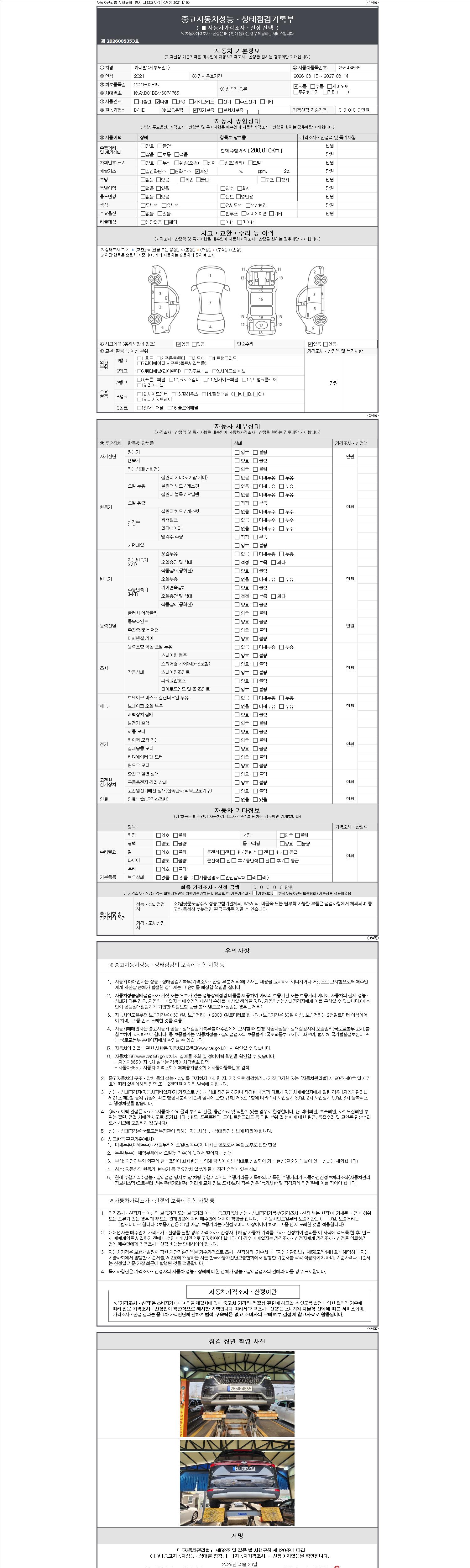 자동차관리법 시행규칙 제120조의 규정에 따라 별지 제 82호서식 《중고자동차 성능, 상태점검 기록부》를 발행한 성능, 상태점검자 및 매매자는 아래의 보증기간 또는 보증거리 이내의 중고자동차, 성능점검 기록부에 기재된 내용과 자동차의 실제 성능, 상태가 다른 경우 계약 또는 관계법령에 따라 매수인에 대하여 책임을 집니다.