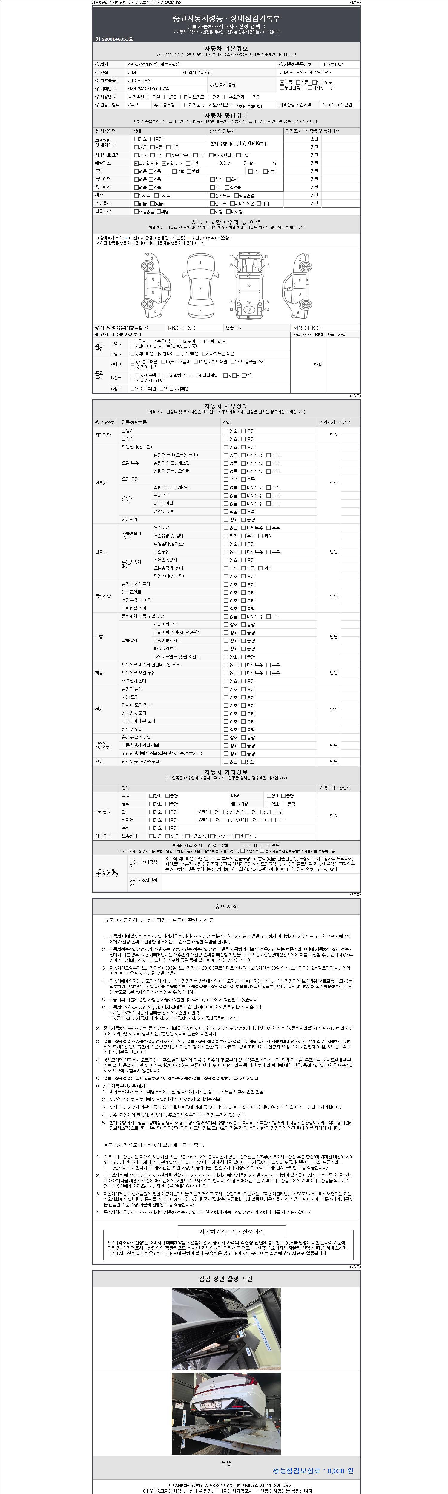 자동차관리법 시행규칙 제120조의 규정에 따라 별지 제 82호서식 《중고자동차 성능, 상태점검 기록부》를 발행한 성능, 상태점검자 및 매매자는 아래의 보증기간 또는 보증거리 이내의 중고자동차, 성능점검 기록부에 기재된 내용과 자동차의 실제 성능, 상태가 다른 경우 계약 또는 관계법령에 따라 매수인에 대하여 책임을 집니다.