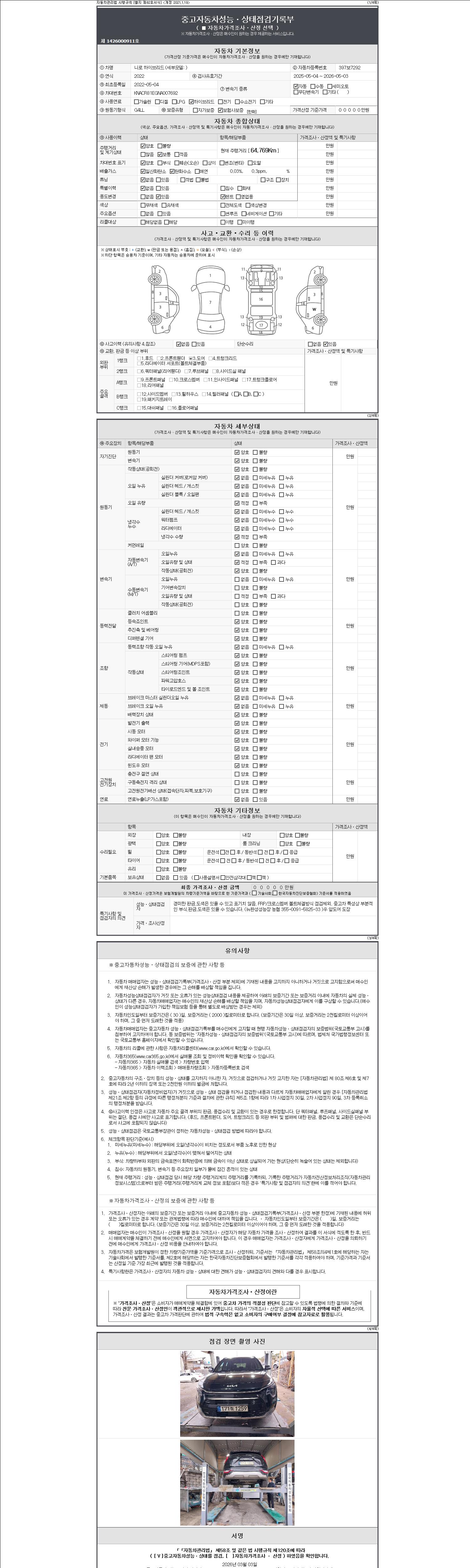 자동차관리법 시행규칙 제120조의 규정에 따라 별지 제 82호서식 《중고자동차 성능, 상태점검 기록부》를 발행한 성능, 상태점검자 및 매매자는 아래의 보증기간 또는 보증거리 이내의 중고자동차, 성능점검 기록부에 기재된 내용과 자동차의 실제 성능, 상태가 다른 경우 계약 또는 관계법령에 따라 매수인에 대하여 책임을 집니다.