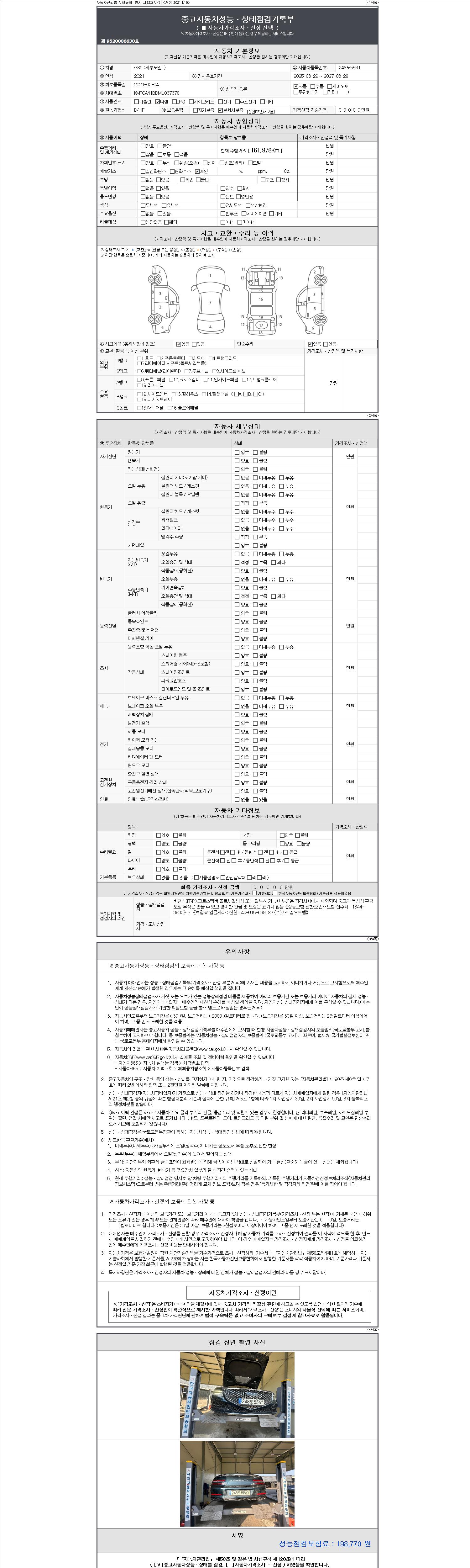 자동차관리법 시행규칙 제120조의 규정에 따라 별지 제 82호서식 《중고자동차 성능, 상태점검 기록부》를 발행한 성능, 상태점검자 및 매매자는 아래의 보증기간 또는 보증거리 이내의 중고자동차, 성능점검 기록부에 기재된 내용과 자동차의 실제 성능, 상태가 다른 경우 계약 또는 관계법령에 따라 매수인에 대하여 책임을 집니다.