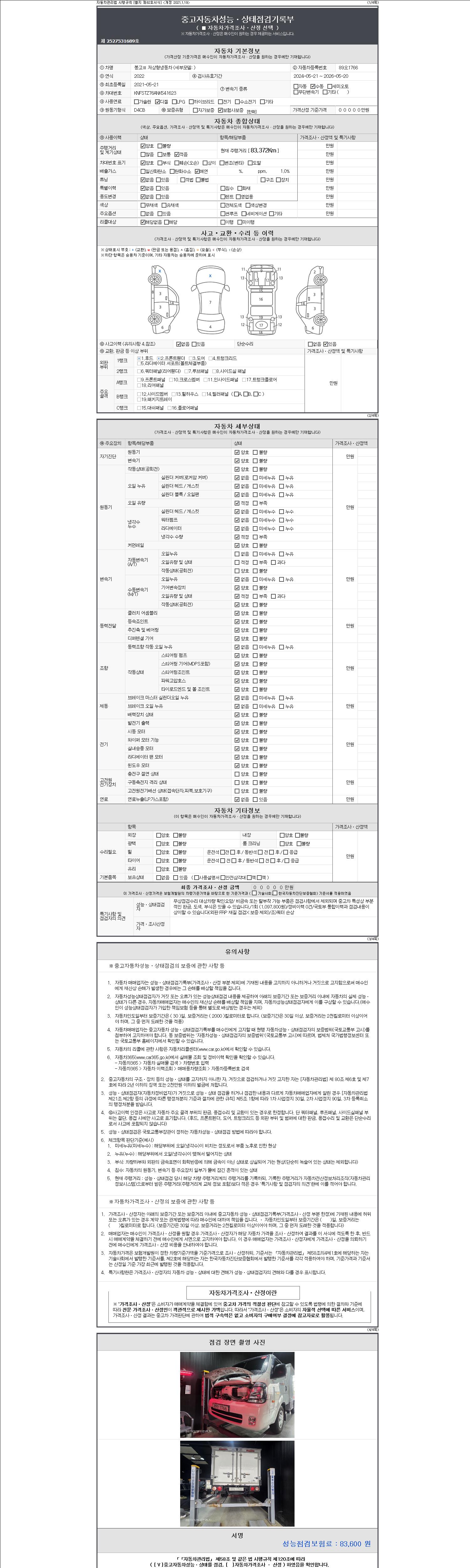 | 주행거리 | 83,218 km | 차량번호 | 89오1766 | 사고유무 | 성능기록부 참조 | 제시번호 | 제 2147483647 호 |