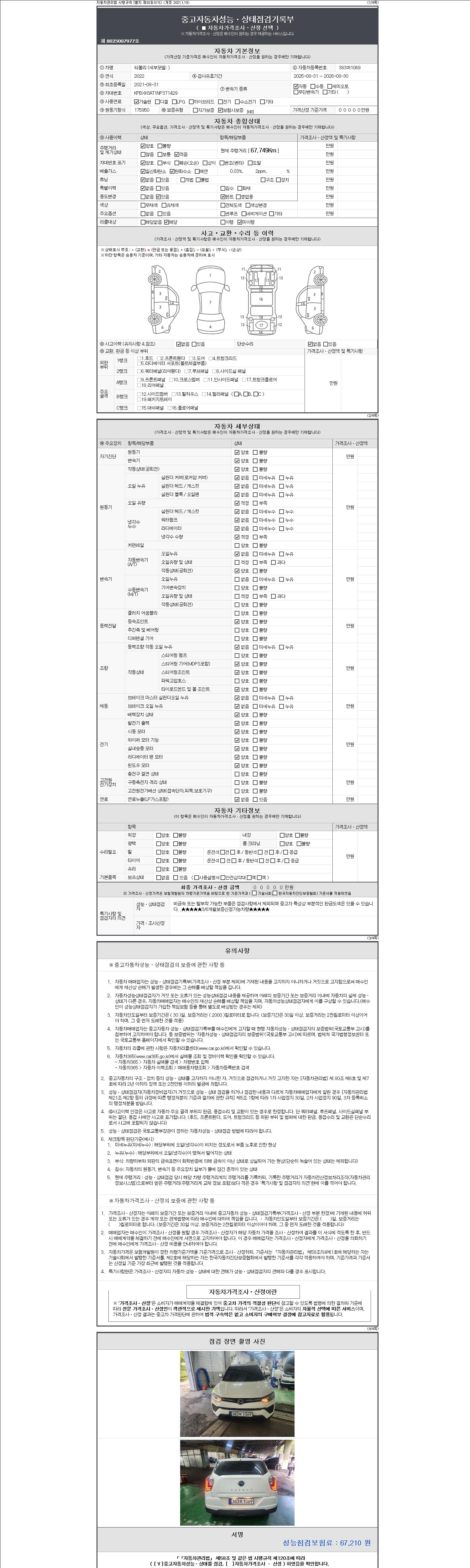 | 주행거리 | 67,749 km | 차량번호 | 383머1069 | 사고유무 | 성능기록부 참조 | 제시번호 | 제 2147483647 호 |