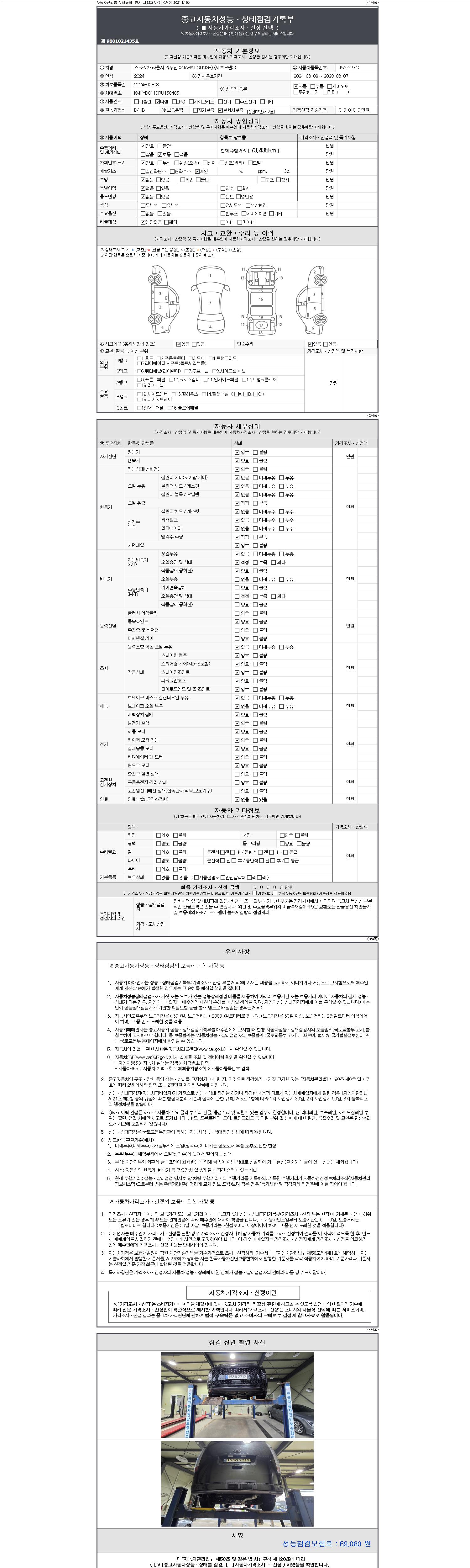 자동차관리법 시행규칙 제120조의 규정에 따라 별지 제 82호서식 《중고자동차 성능, 상태점검 기록부》를 발행한 성능, 상태점검자 및 매매자는 아래의 보증기간 또는 보증거리 이내의 중고자동차, 성능점검 기록부에 기재된 내용과 자동차의 실제 성능, 상태가 다른 경우 계약 또는 관계법령에 따라 매수인에 대하여 책임을 집니다.