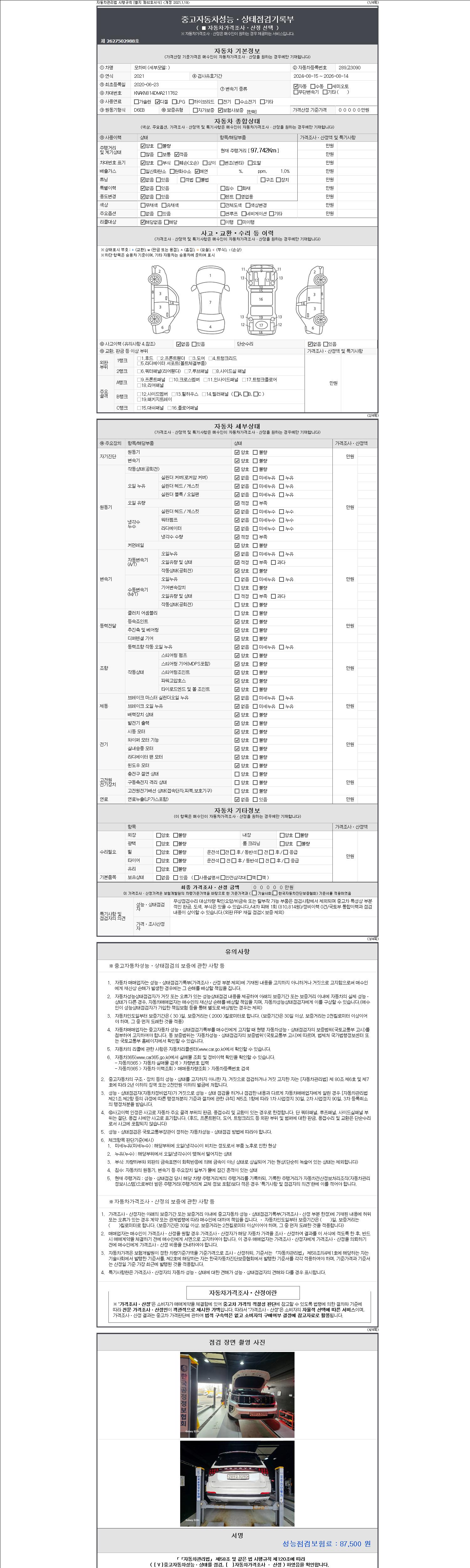 -중고자동차 매매업자를 통해 차량을 구입하실 경우 반드시 "중고자동차 성능, 상태점검 기록부"를 교뷰 받으셔야 하며, 매매업자는 반드시 의무 교부 하여야 압니다.