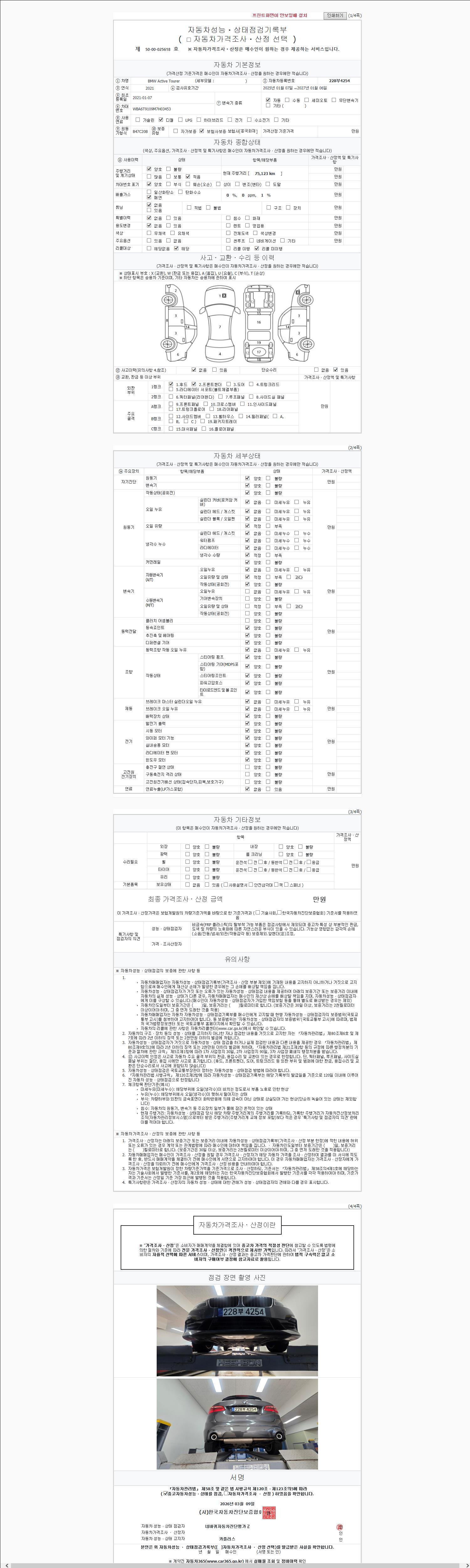 | 주행거리 | 75,123 km | 차량번호 | 228부4254 | 사고유무 | 성능기록부 참조 | 제시번호 | 제 2147483647 호 |