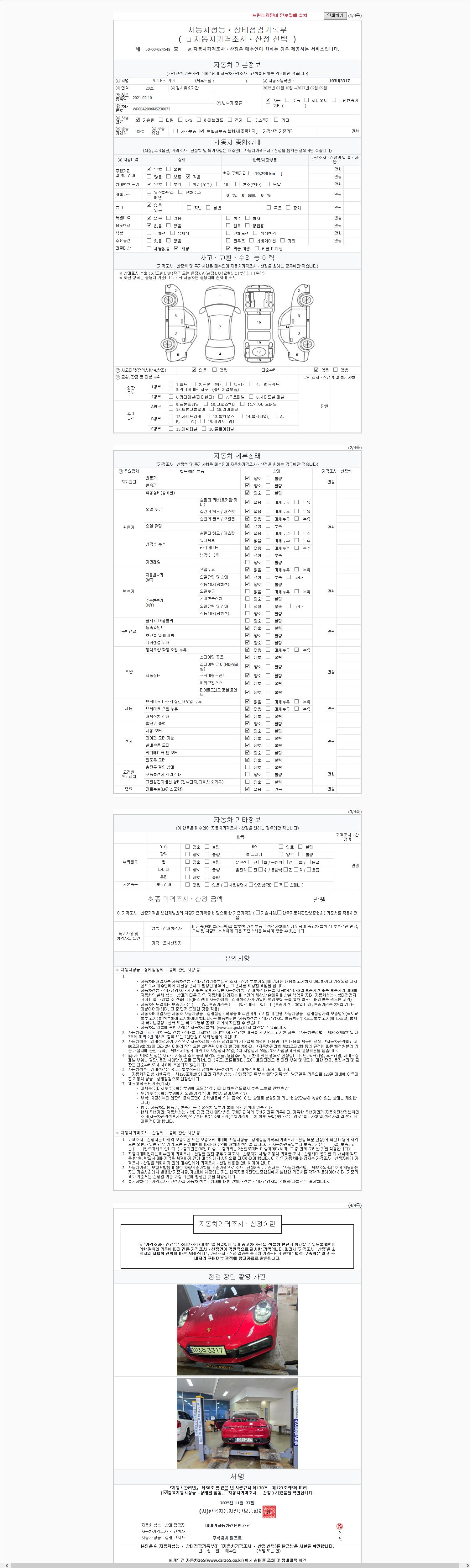 | 주행거리 | 19,298 km | 차량번호 | 103마3317 | 사고유무 | 성능기록부 참조 | 제시번호 | 제 2147483647 호 |