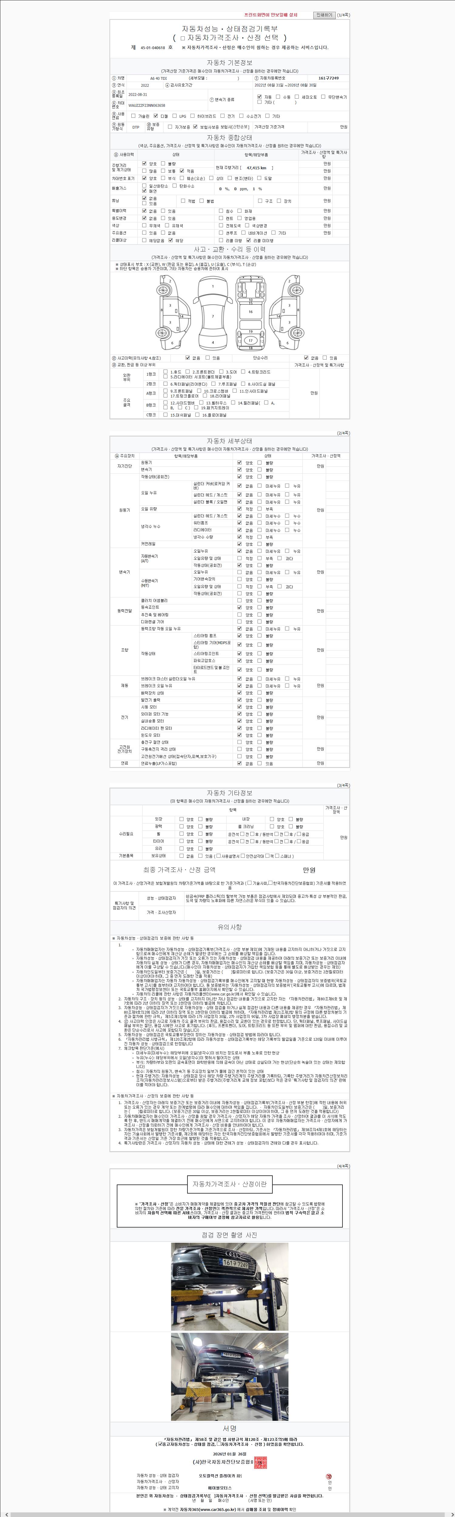 | 주행거리 | 47,415 km | 차량번호 | 161구7249 | 사고유무 | 성능기록부 참조 | 제시번호 | 제 2147483647 호 |