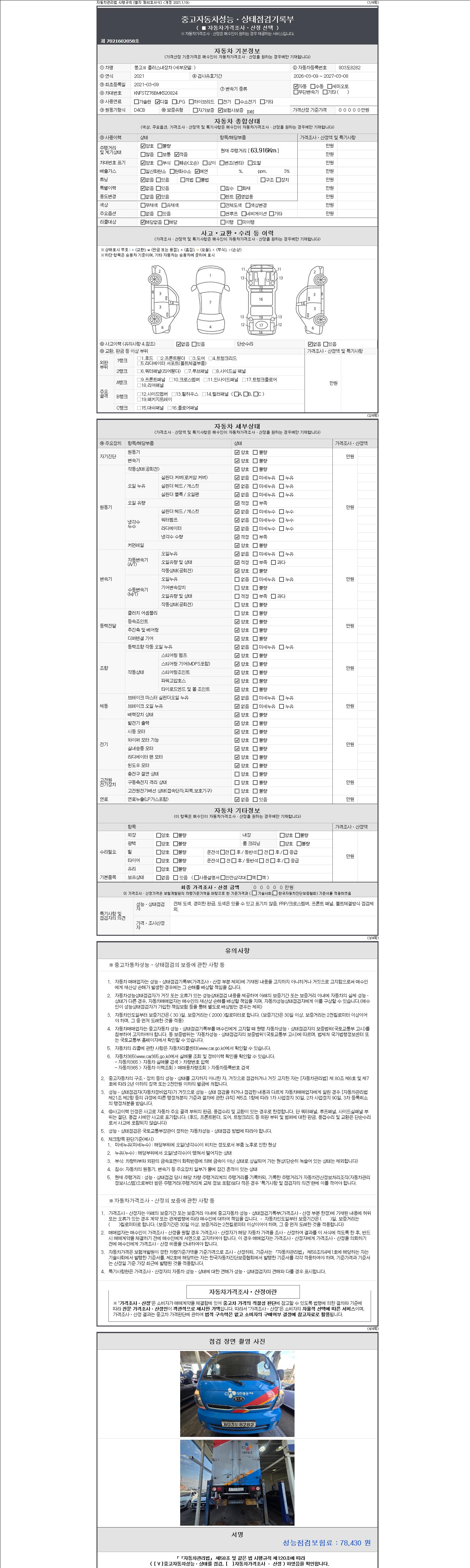 | 주행거리 | 63,916 km | 차량번호 | 803도8282 | 사고유무 | 성능기록부 참조 | 제시번호 | 제 2147483647 호 |