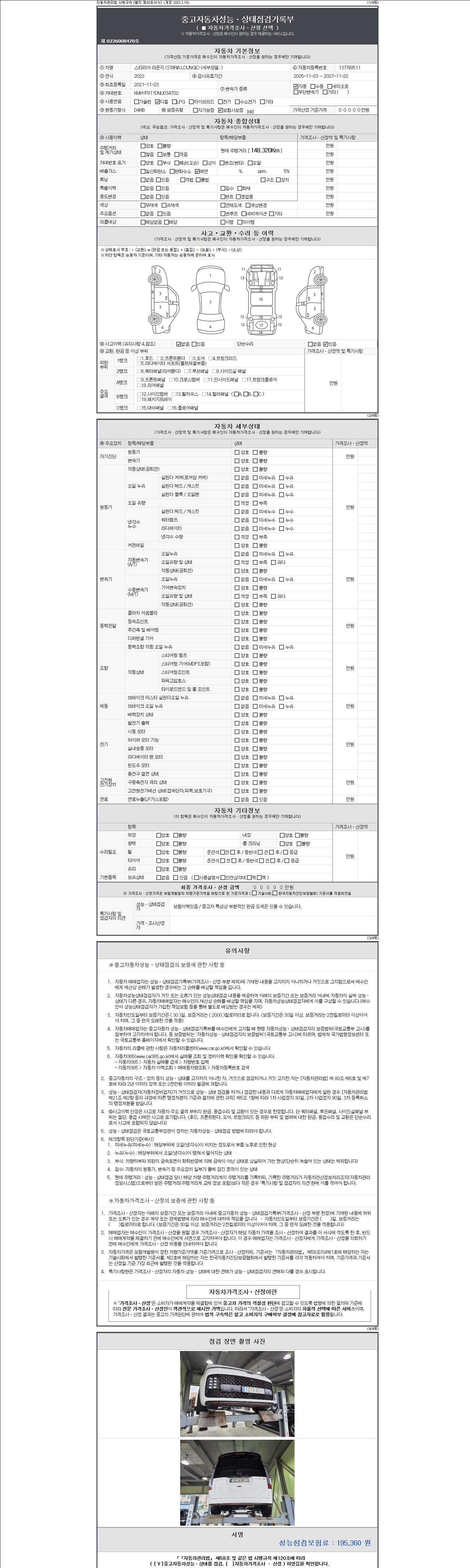 자동차관리법 시행규칙 제120조의 규정에 따라 별지 제 82호서식 《중고자동차 성능, 상태점검 기록부》를 발행한 성능, 상태점검자 및 매매자는 아래의 보증기간 또는 보증거리 이내의 중고자동차, 성능점검 기록부에 기재된 내용과 자동차의 실제 성능, 상태가 다른 경우 계약 또는 관계법령에 따라 매수인에 대하여 책임을 집니다.